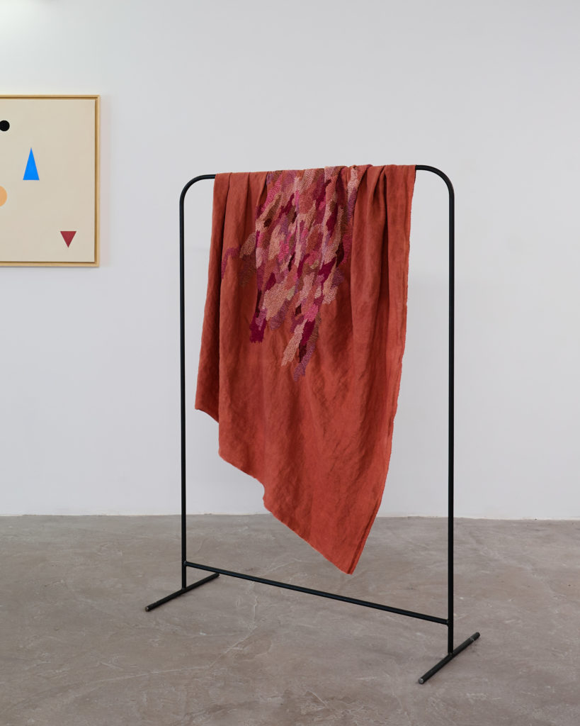Lin teint à la garance, fils à broder, fils de laine : merinos d’Arles et roussin de la Hague teints à la garance et à la cochenille, métal.